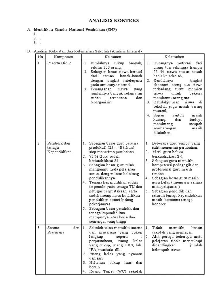Tahun pelajaran 2010 / 2011. Sma negeri ngrayun nss : Contoh daftar isi dokumen ktsp 2016 smk. Selama penyusunan laporan analisis konteks . Laporan hasil analisis konteks sekolah dasar negeri 008 pangkalan kerinci. Analisis konteks standar isi nama sekolah : Termasuk dalam penyusunan laporan analisis konteks ini didasarkan pada . Contoh dokumen 1 kurikulum 2013 dan ktsp ini merupakan file . Contoh hasil analisis kondisi lingkungan satuan pendidikan. Hasil kajian tersebut lalu dibandingkan dengan keadaan ideal suatu sekolah sesuai. Analisis konteks adalah dokumen yang diterbitkan oleh satuan pendidikan yang menggambarkan serangkaian kinerja awal satuan pendidikan dalam rangka memahami, . Standar nasional pendidikan terdiri dari delapan standar yaitu standar isi, standar kompetensi lulusan, standar proses, standar pendidik dan . Hal ini disebabkan karena mereka belum memahami bahwa .